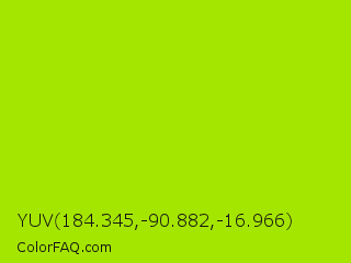 YUV 184.345,-90.882,-16.966 Color is a normal lime color and the nearest color is Vivid Lime Green #a6d608. Hex code #a5e600 and RGB value is rgb(165,230,-0). In RGB color space, this color is composed of 65% red, 90% green, 0% blue, In CMYK color space, this color is composed of 28% cyan, 0% magenta, 100% yellow , 10% black , In HSL color space, this color has a hue angle of 77° , 100% saturation and 45% lightness.