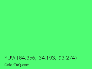 YUV 184.356,-34.193,-93.274 Color is a light green color and the nearest color is Screamin Green #66ff66. Hex code #4efc73 and RGB value is rgb(78,252,115). In RGB color space, this color is composed of 31% red, 99% green, 45% blue, In CMYK color space, this color is composed of 69% cyan, 0% magenta, 54% yellow , 1% black , In HSL color space, this color has a hue angle of 133° , 97% saturation and 65% lightness.