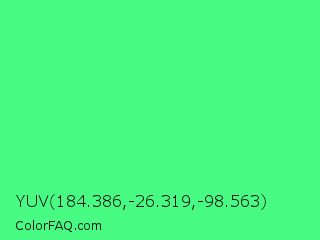YUV 184.386,-26.319,-98.563 Color is a light green color and the nearest color is Very Light Malachite Green #64e986. Hex code #48fc83 and RGB value is rgb(72,252,131). In RGB color space, this color is composed of 28% red, 99% green, 51% blue, In CMYK color space, this color is composed of 71% cyan, 0% magenta, 48% yellow , 1% black , In HSL color space, this color has a hue angle of 140° , 97% saturation and 64% lightness.