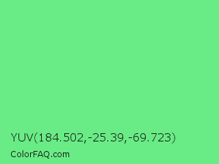 YUV 184.502,-25.39,-69.723 Color is a light green color and the nearest color is Very Light Malachite Green #64e986. Hex code #69eb85 and RGB value is rgb(105,235,133). In RGB color space, this color is composed of 41% red, 92% green, 52% blue, In CMYK color space, this color is composed of 55% cyan, 0% magenta, 43% yellow , 8% black , In HSL color space, this color has a hue angle of 133° , 76% saturation and 67% lightness.
