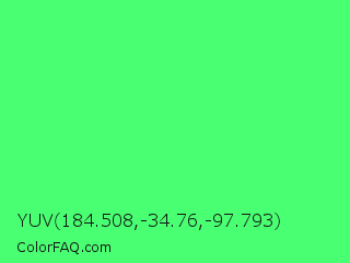 YUV 184.508,-34.76,-97.793 Color is a light green color and the nearest color is Screamin Green #66ff66. Hex code #49ff72 and RGB value is rgb(73,255,114). In RGB color space, this color is composed of 29% red, 100% green, 45% blue, In CMYK color space, this color is composed of 71% cyan, 0% magenta, 55% yellow , 0% black , In HSL color space, this color has a hue angle of 134° , 100% saturation and 64% lightness.
