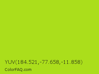 YUV 184.521,-77.658,-11.858 Color is a normal lime color and the nearest color is Inch Worm #b0e313. Hex code #abde1b and RGB value is rgb(171,222,27). In RGB color space, this color is composed of 67% red, 87% green, 11% blue, In CMYK color space, this color is composed of 23% cyan, 0% magenta, 88% yellow , 13% black , In HSL color space, this color has a hue angle of 76° , 78% saturation and 49% lightness.
