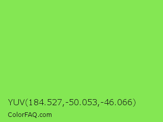 YUV 184.527,-50.053,-46.066 Color is a light green color and the nearest color is Kiwi #8ee53f. Hex code #84e753 and RGB value is rgb(132,231,83). In RGB color space, this color is composed of 52% red, 91% green, 33% blue, In CMYK color space, this color is composed of 43% cyan, 0% magenta, 64% yellow , 9% black , In HSL color space, this color has a hue angle of 100° , 76% saturation and 62% lightness.
