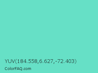 YUV 184.558,6.627,-72.403 Color is a light cyan color and the nearest color is Downy #6fd0c5. Hex code #66e0c6 and RGB value is rgb(102,224,198). In RGB color space, this color is composed of 40% red, 88% green, 78% blue, In CMYK color space, this color is composed of 54% cyan, 0% magenta, 12% yellow , 12% black , In HSL color space, this color has a hue angle of 167° , 66% saturation and 64% lightness.