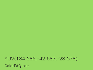 YUV 184.586,-42.687,-28.578 Color is a light green color and the nearest color is Pistachio #93c572. Hex code #98da62 and RGB value is rgb(152,218,98). In RGB color space, this color is composed of 60% red, 85% green, 38% blue, In CMYK color space, this color is composed of 30% cyan, 0% magenta, 55% yellow , 15% black , In HSL color space, this color has a hue angle of 93° , 62% saturation and 62% lightness.