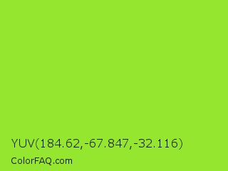 YUV 184.62,-67.847,-32.116 Color is a normal green color and the nearest color is Kiwi #8ee53f. Hex code #94e62f and RGB value is rgb(148,230,47). In RGB color space, this color is composed of 58% red, 90% green, 18% blue, In CMYK color space, this color is composed of 36% cyan, 0% magenta, 80% yellow , 10% black , In HSL color space, this color has a hue angle of 87° , 79% saturation and 54% lightness.