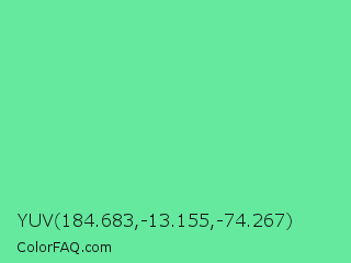 YUV 184.683,-13.155,-74.267 Color is a light green color and the nearest color is Medium Aquamarine #66ddaa. Hex code #64e99e and RGB value is rgb(100,233,158). In RGB color space, this color is composed of 39% red, 91% green, 62% blue, In CMYK color space, this color is composed of 57% cyan, 0% magenta, 32% yellow , 9% black , In HSL color space, this color has a hue angle of 146° , 75% saturation and 65% lightness.