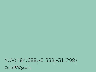 YUV 184.688,-0.339,-31.298 Color is a light green color and the nearest color is Shadow Green #9ac2b8. Hex code #95cbb8 and RGB value is rgb(149,203,184). In RGB color space, this color is composed of 58% red, 80% green, 72% blue, In CMYK color space, this color is composed of 27% cyan, 0% magenta, 9% yellow , 20% black , In HSL color space, this color has a hue angle of 159° , 34% saturation and 69% lightness.