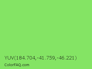 YUV 184.704,-41.759,-46.221 Color is a light green color and the nearest color is Pastel Green #77dd77. Hex code #84e464 and RGB value is rgb(132,228,100). In RGB color space, this color is composed of 52% red, 89% green, 39% blue, In CMYK color space, this color is composed of 42% cyan, 0% magenta, 56% yellow , 11% black , In HSL color space, this color has a hue angle of 105° , 70% saturation and 64% lightness.