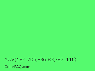 YUV 184.705,-36.83,-87.441 Color is a light green color and the nearest color is Screamin Green #66ff66. Hex code #55fa6e and RGB value is rgb(85,250,110). In RGB color space, this color is composed of 33% red, 98% green, 43% blue, In CMYK color space, this color is composed of 66% cyan, 0% magenta, 56% yellow , 2% black , In HSL color space, this color has a hue angle of 129° , 94% saturation and 66% lightness.