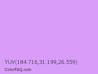 YUV 184.716,31.199,26.559 Color is a light purple color and the nearest color is Pale Violet #cc99ff. Hex code #d79df8 and RGB value is rgb(215,157,248). In RGB color space, this color is composed of 84% red, 62% green, 97% blue, In CMYK color space, this color is composed of 13% cyan, 37% magenta, 0% yellow , 3% black , In HSL color space, this color has a hue angle of 278° , 87% saturation and 79% lightness.