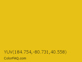 YUV 184.754,-80.731,40.558 Color is a normal yellow color and the nearest color is Gold Tips #deba13. Hex code #e7c115 and RGB value is rgb(231,193,21). In RGB color space, this color is composed of 91% red, 76% green, 8% blue, In CMYK color space, this color is composed of 0% cyan, 16% magenta, 91% yellow , 9% black , In HSL color space, this color has a hue angle of 49° , 83% saturation and 49% lightness.