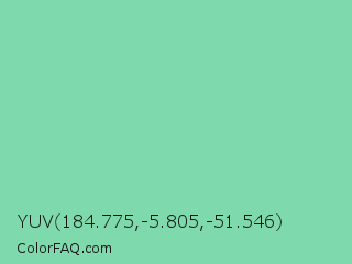YUV 184.775,-5.805,-51.546 Color is a light green color and the nearest color is Vista Blue #8fd6b4. Hex code #7ed9ad and RGB value is rgb(126,217,173). In RGB color space, this color is composed of 49% red, 85% green, 68% blue, In CMYK color space, this color is composed of 42% cyan, 0% magenta, 20% yellow , 15% black , In HSL color space, this color has a hue angle of 151° , 54% saturation and 67% lightness.