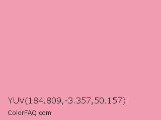 YUV 184.809,-3.357,50.157 Color is a light red color and the nearest color is Wewak #f19bab. Hex code #f29db2 and RGB value is rgb(242,157,178). In RGB color space, this color is composed of 95% red, 62% green, 70% blue, In CMYK color space, this color is composed of 0% cyan, 35% magenta, 26% yellow , 5% black , In HSL color space, this color has a hue angle of 345° , 77% saturation and 78% lightness.