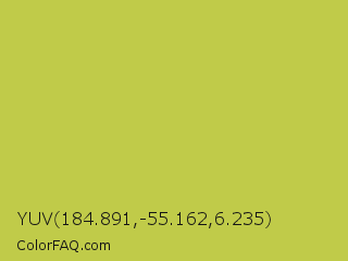YUV 184.891,-55.162,6.235 Color is a normal yellow color and the nearest color is Turmeric #cabb48. Hex code #c0cb49 and RGB value is rgb(192,203,73). In RGB color space, this color is composed of 75% red, 80% green, 29% blue, In CMYK color space, this color is composed of 5% cyan, 0% magenta, 64% yellow , 20% black , In HSL color space, this color has a hue angle of 65° , 56% saturation and 54% lightness.