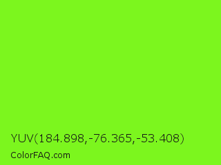 YUV 184.898,-76.365,-53.408 Color is a normal green color and the nearest color is Spring Frost #87ff2a. Hex code #7cf61e and RGB value is rgb(124,246,30). In RGB color space, this color is composed of 49% red, 96% green, 12% blue, In CMYK color space, this color is composed of 50% cyan, 0% magenta, 88% yellow , 4% black , In HSL color space, this color has a hue angle of 94° , 92% saturation and 54% lightness.