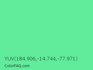 YUV 184.906,-14.744,-77.971 Color is a light green color and the nearest color is Very Light Malachite Green #64e986. Hex code #60ec9b and RGB value is rgb(96,236,155). In RGB color space, this color is composed of 38% red, 93% green, 61% blue, In CMYK color space, this color is composed of 59% cyan, 0% magenta, 34% yellow , 7% black , In HSL color space, this color has a hue angle of 145° , 79% saturation and 65% lightness.