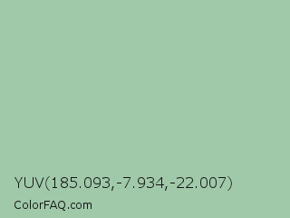 YUV 185.093,-7.934,-22.007 Color is a light green color and the nearest color is Cambridge Blue #a3c1ad. Hex code #a0c9a9 and RGB value is rgb(160,201,169). In RGB color space, this color is composed of 63% red, 79% green, 66% blue, In CMYK color space, this color is composed of 20% cyan, 0% magenta, 16% yellow , 21% black , In HSL color space, this color has a hue angle of 133° , 28% saturation and 71% lightness.