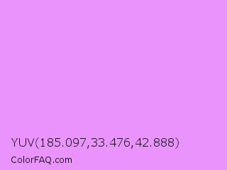 YUV 185.097,33.476,42.888 Color is a light purple color and the nearest color is Rich Brilliant Lavender #f1a7fe. Hex code #ea93fd and RGB value is rgb(234,147,253). In RGB color space, this color is composed of 92% red, 58% green, 99% blue, In CMYK color space, this color is composed of 8% cyan, 42% magenta, 0% yellow , 1% black , In HSL color space, this color has a hue angle of 289° , 96% saturation and 78% lightness.