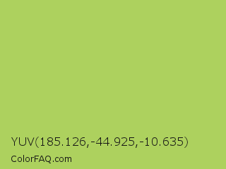 YUV 185.126,-44.925,-10.635 Color is a normal lime color and the nearest color is Middle Green Yellow #acbf60. Hex code #add15e and RGB value is rgb(173,209,94). In RGB color space, this color is composed of 68% red, 82% green, 37% blue, In CMYK color space, this color is composed of 17% cyan, 0% magenta, 55% yellow , 18% black , In HSL color space, this color has a hue angle of 79° , 56% saturation and 59% lightness.