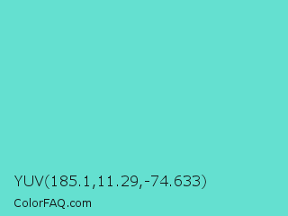 YUV 185.1,11.29,-74.633 Color is a light cyan color and the nearest color is Downy #6fd0c5. Hex code #64e0d0 and RGB value is rgb(100,224,208). In RGB color space, this color is composed of 39% red, 88% green, 82% blue, In CMYK color space, this color is composed of 55% cyan, 0% magenta, 7% yellow , 12% black , In HSL color space, this color has a hue angle of 172° , 67% saturation and 64% lightness.