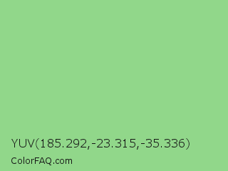 YUV 185.292,-23.315,-35.336 Color is a light green color and the nearest color is Feijoa #9fdd8c. Hex code #91d78a and RGB value is rgb(145,215,138). In RGB color space, this color is composed of 57% red, 84% green, 54% blue, In CMYK color space, this color is composed of 33% cyan, 0% magenta, 36% yellow , 16% black , In HSL color space, this color has a hue angle of 115° , 49% saturation and 69% lightness.