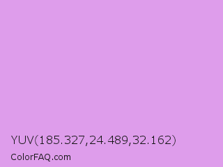 YUV 185.327,24.489,32.162 Color is a light purple color and the nearest color is Bright Ube #d19fe8. Hex code #de9deb and RGB value is rgb(222,157,235). In RGB color space, this color is composed of 87% red, 62% green, 92% blue, In CMYK color space, this color is composed of 6% cyan, 33% magenta, 0% yellow , 8% black , In HSL color space, this color has a hue angle of 290° , 66% saturation and 77% lightness.