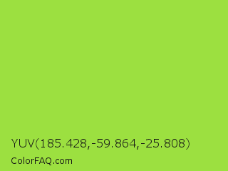 YUV 185.428,-59.864,-25.808 Color is a normal green color and the nearest color is Kiwi #8ee53f. Hex code #9ce040 and RGB value is rgb(156,224,64). In RGB color space, this color is composed of 61% red, 88% green, 25% blue, In CMYK color space, this color is composed of 30% cyan, 0% magenta, 71% yellow , 12% black , In HSL color space, this color has a hue angle of 86° , 72% saturation and 56% lightness.