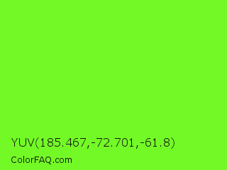 YUV 185.467,-72.701,-61.8 Color is a normal green color and the nearest color is Spring Frost #87ff2a. Hex code #73fa26 and RGB value is rgb(115,250,38). In RGB color space, this color is composed of 45% red, 98% green, 15% blue, In CMYK color space, this color is composed of 54% cyan, 0% magenta, 85% yellow , 2% black , In HSL color space, this color has a hue angle of 98° , 95% saturation and 56% lightness.