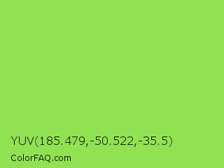 YUV 185.479,-50.522,-35.5 Color is a light green color and the nearest color is Kiwi #8ee53f. Hex code #91e253 and RGB value is rgb(145,226,83). In RGB color space, this color is composed of 57% red, 89% green, 33% blue, In CMYK color space, this color is composed of 36% cyan, 0% magenta, 63% yellow , 11% black , In HSL color space, this color has a hue angle of 94° , 71% saturation and 61% lightness.