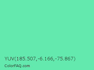 YUV 185.507,-6.166,-75.867 Color is a light green color and the nearest color is Medium Aquamarine #66ddaa. Hex code #63e8ad and RGB value is rgb(99,232,173). In RGB color space, this color is composed of 39% red, 91% green, 68% blue, In CMYK color space, this color is composed of 57% cyan, 0% magenta, 25% yellow , 9% black , In HSL color space, this color has a hue angle of 153° , 74% saturation and 65% lightness.