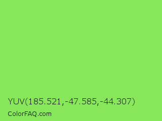YUV 185.521,-47.585,-44.307 Color is a light green color and the nearest color is Kiwi #8ee53f. Hex code #87e659 and RGB value is rgb(135,230,89). In RGB color space, this color is composed of 53% red, 90% green, 35% blue, In CMYK color space, this color is composed of 41% cyan, 0% magenta, 61% yellow , 10% black , In HSL color space, this color has a hue angle of 100° , 74% saturation and 63% lightness.