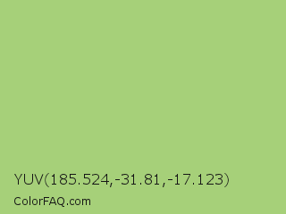YUV 185.524,-31.81,-17.123 Color is a light green color and the nearest color is Pistachio #93c572. Hex code #a6d079 and RGB value is rgb(166,208,121). In RGB color space, this color is composed of 65% red, 82% green, 47% blue, In CMYK color space, this color is composed of 20% cyan, 0% magenta, 42% yellow , 18% black , In HSL color space, this color has a hue angle of 89° , 48% saturation and 65% lightness.