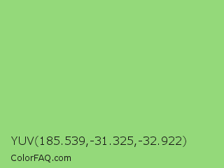 YUV 185.539,-31.325,-32.922 Color is a light green color and the nearest color is Feijoa #9fdd8c. Hex code #94d97a and RGB value is rgb(148,217,122). In RGB color space, this color is composed of 58% red, 85% green, 48% blue, In CMYK color space, this color is composed of 32% cyan, 0% magenta, 44% yellow , 15% black , In HSL color space, this color has a hue angle of 104° , 56% saturation and 66% lightness.