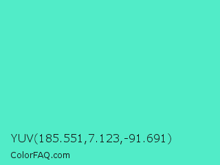 YUV 185.551,7.123,-91.691 Color is a light cyan color and the nearest color is Turquoise #40e0d0. Hex code #51ecc8 and RGB value is rgb(81,236,200). In RGB color space, this color is composed of 32% red, 93% green, 78% blue, In CMYK color space, this color is composed of 66% cyan, 0% magenta, 15% yellow , 7% black , In HSL color space, this color has a hue angle of 166° , 80% saturation and 62% lightness.