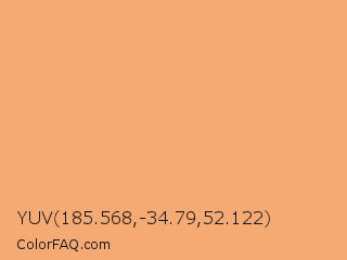 YUV 185.568,-34.79,52.122 Color is a light orange color and the nearest color is Middle Yellow Red #ecb176. Hex code #f5a973 and RGB value is rgb(245,169,115). In RGB color space, this color is composed of 96% red, 66% green, 45% blue, In CMYK color space, this color is composed of 0% cyan, 31% magenta, 53% yellow , 4% black , In HSL color space, this color has a hue angle of 25° , 87% saturation and 71% lightness.