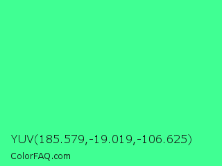 YUV 185.579,-19.019,-106.625 Color is a light green color and the nearest color is Very Light Malachite Green #64e986. Hex code #40ff93 and RGB value is rgb(64,255,147). In RGB color space, this color is composed of 25% red, 100% green, 58% blue, In CMYK color space, this color is composed of 75% cyan, 0% magenta, 42% yellow , 0% black , In HSL color space, this color has a hue angle of 146° , 100% saturation and 63% lightness.