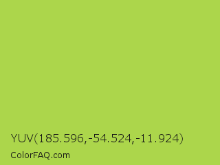 YUV 185.596,-54.524,-11.924 Color is a normal lime color and the nearest color is Conifer #acdd4d. Hex code #acd64b and RGB value is rgb(172,214,75). In RGB color space, this color is composed of 67% red, 84% green, 29% blue, In CMYK color space, this color is composed of 20% cyan, 0% magenta, 65% yellow , 16% black , In HSL color space, this color has a hue angle of 78° , 63% saturation and 57% lightness.