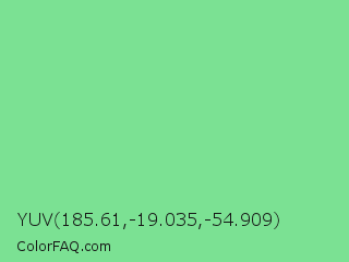 YUV 185.61,-19.035,-54.909 Color is a light green color and the nearest color is Light Green #90ee90. Hex code #7be193 and RGB value is rgb(123,225,147). In RGB color space, this color is composed of 48% red, 88% green, 58% blue, In CMYK color space, this color is composed of 45% cyan, 0% magenta, 35% yellow , 12% black , In HSL color space, this color has a hue angle of 134° , 63% saturation and 68% lightness.