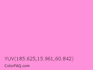 YUV 185.625,15.961,60.842 Color is a light magenta color and the nearest color is Princess Perfume #ff85cf. Hex code #ff90da and RGB value is rgb(255,144,218). In RGB color space, this color is composed of 100% red, 56% green, 85% blue, In CMYK color space, this color is composed of 0% cyan, 44% magenta, 15% yellow , 0% black , In HSL color space, this color has a hue angle of 320° , 100% saturation and 78% lightness.