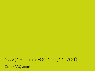 YUV 185.655,-84.133,11.704 Color is a normal yellow color and the nearest color is Bitter Lemon #cae00d. Hex code #c7d40f and RGB value is rgb(199,212,15). In RGB color space, this color is composed of 78% red, 83% green, 6% blue, In CMYK color space, this color is composed of 6% cyan, 0% magenta, 93% yellow , 17% black , In HSL color space, this color has a hue angle of 64° , 87% saturation and 45% lightness.