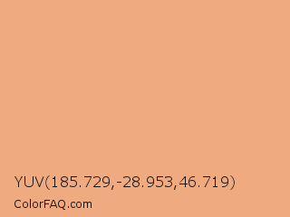 YUV 185.729,-28.953,46.719 Color is a light orange color and the nearest color is Tacao #edb381. Hex code #efaa7f and RGB value is rgb(239,170,127). In RGB color space, this color is composed of 94% red, 67% green, 50% blue, In CMYK color space, this color is composed of 0% cyan, 29% magenta, 47% yellow , 6% black , In HSL color space, this color has a hue angle of 23° , 78% saturation and 72% lightness.
