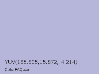 YUV 185.805,15.872,-4.214 Color is a light blue color and the nearest color is Pigeon Post #afbdd9. Hex code #b5b6da and RGB value is rgb(181,182,218). In RGB color space, this color is composed of 71% red, 71% green, 85% blue, In CMYK color space, this color is composed of 17% cyan, 17% magenta, 0% yellow , 15% black , In HSL color space, this color has a hue angle of 238° , 33% saturation and 78% lightness.