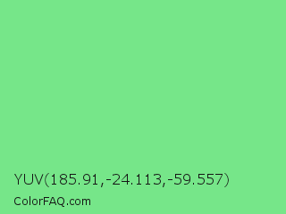 YUV 185.91,-24.113,-59.557 Color is a light green color and the nearest color is Very Light Malachite Green #64e986. Hex code #76e689 and RGB value is rgb(118,230,137). In RGB color space, this color is composed of 46% red, 90% green, 54% blue, In CMYK color space, this color is composed of 49% cyan, 0% magenta, 40% yellow , 10% black , In HSL color space, this color has a hue angle of 130° , 69% saturation and 68% lightness.