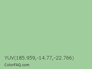 YUV 185.959,-14.77,-22.766 Color is a light green color and the nearest color is Eton Blue #96c8a2. Hex code #a0cd9c and RGB value is rgb(160,205,156). In RGB color space, this color is composed of 63% red, 80% green, 61% blue, In CMYK color space, this color is composed of 22% cyan, 0% magenta, 24% yellow , 20% black , In HSL color space, this color has a hue angle of 115° , 33% saturation and 71% lightness.