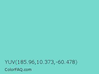 YUV 185.96,10.373,-60.478 Color is a light cyan color and the nearest color is Bermuda #7dd8c6. Hex code #75d9cf and RGB value is rgb(117,217,207). In RGB color space, this color is composed of 46% red, 85% green, 81% blue, In CMYK color space, this color is composed of 46% cyan, 0% magenta, 5% yellow , 15% black , In HSL color space, this color has a hue angle of 174° , 57% saturation and 65% lightness.