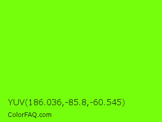 YUV 186.036,-85.8,-60.545 Color is a normal green color and the nearest color is Lawn Green #7cfc00. Hex code #75ff0c and RGB value is rgb(117,255,12). In RGB color space, this color is composed of 46% red, 100% green, 5% blue, In CMYK color space, this color is composed of 54% cyan, 0% magenta, 95% yellow , 0% black , In HSL color space, this color has a hue angle of 94° , 100% saturation and 52% lightness.