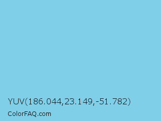 YUV 186.044,23.149,-51.782 Color is a light blue color and the nearest color is Seagull #80ccea. Hex code #7fcfe9 and RGB value is rgb(127,207,233). In RGB color space, this color is composed of 50% red, 81% green, 91% blue, In CMYK color space, this color is composed of 45% cyan, 11% magenta, 0% yellow , 9% black , In HSL color space, this color has a hue angle of 195° , 71% saturation and 71% lightness.