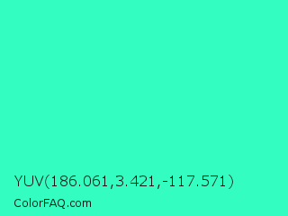 YUV 186.061,3.421,-117.571 Color is a normal green color and the nearest color is Turquoise #40e0d0. Hex code #34fdc1 and RGB value is rgb(52,253,193). In RGB color space, this color is composed of 20% red, 99% green, 76% blue, In CMYK color space, this color is composed of 79% cyan, 0% magenta, 24% yellow , 1% black , In HSL color space, this color has a hue angle of 162° , 98% saturation and 60% lightness.