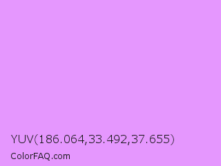 YUV 186.064,33.492,37.655 Color is a light purple color and the nearest color is Rich Brilliant Lavender #f1a7fe. Hex code #e597fe and RGB value is rgb(229,151,254). In RGB color space, this color is composed of 90% red, 59% green, 100% blue, In CMYK color space, this color is composed of 10% cyan, 41% magenta, 0% yellow , 0% black , In HSL color space, this color has a hue angle of 285° , 98% saturation and 79% lightness.